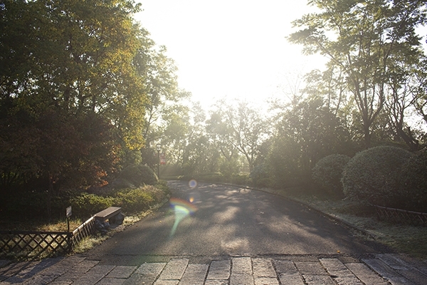 小鎮(zhèn)還未蘇醒,我們?nèi)ビ舆@份晨光,清晨的太陽冉冉升起,蔚藍(lán)色的天空分外惹眼,這份色彩是我們平日難以見到的光景。太陽是那么耀眼,你沒辦法與他對視,透過指縫,穿過林間,照耀在大地,石階小板抹上了斑駁的金色,所以你才知道,“嗯,太陽,他原來就在那里。”